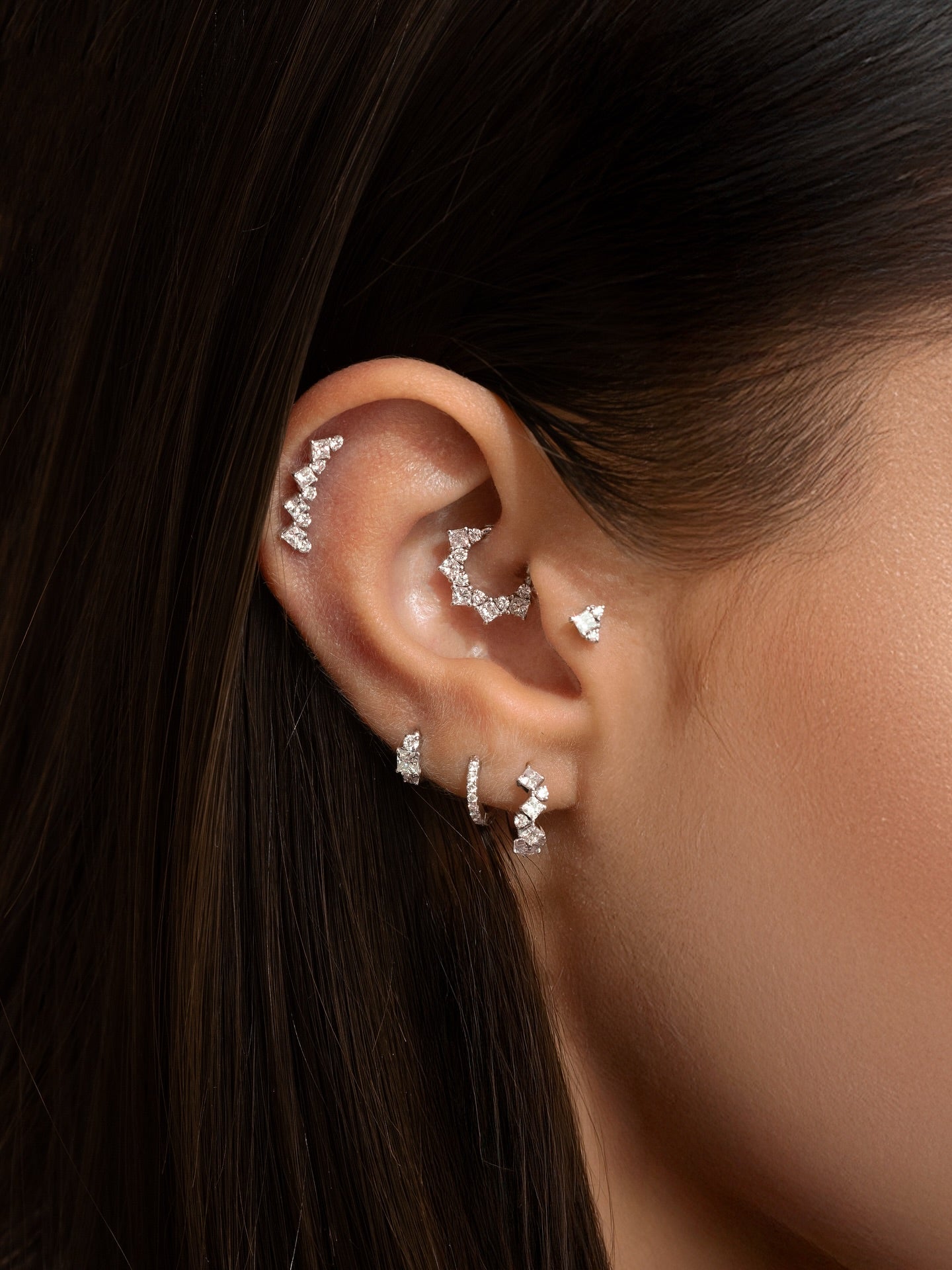 Explore top ear piercing ideas with our curated selection, featuring customizable styles in 18k gold and set with natural diamonds.From hoops and studs to a variety of diamond shapes, these compositions offer endless ways to personalize your ear look with timeless, high-quality materials.